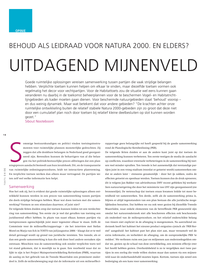 TOETS040618Sommige bestuurskundigen en politici vinden toetsingsinstru-menten voor ruimtelijke plannen monsterlijke gedrochten. Zijzeggen dat alle denkbare belangen in Nederland goed georgani-seerd zijn. Bovendien kunnen de behartigers van al die belan-gen via het politiek-bestuurlijke proces afdwingen dat een plan-ningsproces aandacht besteedt aan hun invalshoek. Dit, en de transparantievan ruimtelijke ordeningsprocedures, leidt tot interactieve planvorming.En verplichte toetsen werken dan alleen maar vertragend. De partijen we-ten zelf wel welke informatie hen helpt.SamenwerkingHoe het ook zij, het is evident dat goede ruimtelijke oplossingen alleen ont-wikkeld kunnen worden in een proces van samenwerking tussen partijendie deels strijdige belangen hebben. Maar wat doen toetsen met die samen-werking? Vormen ze een stimulans daarvoor, of juist niet?De volgende feiten duiden erop dat toetsen kunnen leiden tot een verslechte-ring van samenwerking. Ten eerste zie je veel dat gevallen van toetsing eenjuridiserend effect hebben. In plaats van naast elkaar, komen partijen viatoetsprocessen ogenschijnlijk juist meer tegenover elkaar te staan. Zelfs deCommissie voor de milieueffectrapportage ? zie het interview met StefanMorel en Marja van Eck in TOETS van juli/augustus 2006 ? klaagt dat er te veeldetail gevraagd wordt op grond van juridische vereisten. Ten tweede, als erdan een goede samenwerking is kan die ook door heel andere oorzaken zijnontstaan. Misschien was de samenwerking ook zonder verplichte toets weltot stand gekomen, dat is moeilijk na te gaan. Een voorbeeld waar dat zolijkt te zijn is het Project Mainportontwikkeling Rotterdam (PMR), waarvande aanleg en het gebruik van de Tweede Maasvlakte een prominent onder-deel is. Zelfs de milieubeweging zegt dat de informatie uit een milieueffect-BEhOudalSlEidraadvOOrNaTura2000.ENEldErS?uiTdagENdmijNENvEldgoederuimtelijkeoplossingenvereisensamenwerkingtussenpartijendievaakstrijdigebelangenhebben.verplichtetoetsenkunnenhelpenomelkaartevinden,maardiezelfdetoetsenvormenookregelmatighetdecorvoorvechtpartijen.voordehabitattoetszoudesituatieweleenskunnengaanveranderennudaarbijindetoekomstbeheerplannenvoordetebeschermenvogel-enhabitatricht-lijngebiedenalskadermoetengaandienen.voorbeschermdenatuurgebiedenstaat`behoud'voorop?endusweinigdynamiek.maarwatbetekentdatvooranderegebieden?"dekrachtenachteronzeruimtelijkeontwikkelingbuitenderelatiefstabieleNatura2000-gebiedenzijnzogrootdatdezenietdooreencumulatiefplannochdoortoetsenbijrelatiefkleinedeelbesluitenopslotkunnenwordengezet."SiboutNooteboomopinierapportage geen belangrijke rol heeft gespeeld bij de goede samenwerkingrond de Planologische Kernbeslissing (PKB).De volgende feiten duiden er aan de andere kant juist op dat toetsen desamenwerking kunnen verbeteren. Ten eerste vestigen de media de aandachtop conflicten, waardoor eventuele verbeteringen in de samenwerking bij toet-sen veel minder opvallen. Ten tweede is het aannemelijk dat verstandige par-tijen juist in een vroeg stadium (voordat er getoetst wordt) samenwerken om-dat ze anders later ? eveneens gezamenlijk ? door het ijs zakken, zodra deeffecten getoetst en openbaar worden. Toetsen kunnen dus de druk opvoeren;dit is volgens Jan Bakker van adviesbureau DHV recent gebleken bij werkate-liers natuurwetgeving die door het ministerie van LNV zijn georganiseerd (ziebronnenlijst). De wetenschap dat toetsen eraan kwamen leidde tot meer be-reidheid tot samenwerken. Ten derde, zelfs als de samenwerking prima is,blijven er altijd tegenstanders van een plan bestaan die alle juridische moge-lijkheden benutten. Dat hebben we nu ook weer gezien bij diezelfde TweedeMaasvlakte, waar enkele elementen van de betreffende PKB gesneuveld zijnomdat het natuuronderzoek niet alle beschreven effecten ook beschouwdeals onderdeel van de milieuprocedure, en het relatief onderschikte belangvan vissers niet expliciet in de afweging is meegenomen. Na aanvullend on-derzoek heeft het kabinet het nieuwe product enigszins cynisch als `PKB Her-stel' aangeduid: het kabinet past het plan niet aan, maar verzamelt wel deextra informatie, en verheldert de afweging, om de oorspronkelijke PKB `teredden'. We verliezen ruim een jaar en miljoenen aan onderzoeksgelden om-dat we, gezien op de schaal van deze ontwikkeling, een miniem effectje overhet hoofd hebben gezien. Overheidsbeleid is zo te vergelijken met twee par-tijen in een oorlog die vrede willen sluiten maar dan samen via een mijnen-veld naar de onderhandeltafel moeten lopen. Kortom, toetsen zijn zowel eenbedreiging als een kans voor samenwerking.TOETS040619belangenafweging met zich mee, waarin verschillende stakeholders een rolvervullen. Denk hierbij aan terreinbeherende instanties, gemeenten, water-schappen, boeren, ondernemers en diverse belangenorganisaties.Inhoudelijk wordt van een beheerplan verwacht dat het een inventarisatiemaakt van de natuurwaarden, het gebruik van het gebied en de relatie metandere plannen en wet- en regelgeving. Het beheerplan moet dit alles metelkaar verbinden, doelen uitwerken, maatregelen bepalen en meer duide-lijkheid geven over de uitvoering ervan. Ook moet in het beheerplan wor-den opgenomen welke activiteiten wel en welke niet vergunningplichtigzijn. Hiervoor moet een inventarisatie worden gemaakt van alle bestaandeen verwachte activiteiten in en rond het gebied. Immers, ook activiteitenbuiten het begrensde gebied kunnen effecten hebben op de gestelde natuur-doelen in het gebied, de zogenaamde externe werking. Vervolgens kunnenin het beheerplan activiteiten in en rond Natura 2000-gebieden vrijgesteldworden van vergunningplicht, en dus ook van een Habitattoets. Voor overigeactiviteiten, als die de kans hebben om een significant effect te hebben,moet een Habitattoets worden uitgevoerd; in andere gevallen volstaat dezogenaamde verslechterings- en verstoringstoets. In die zin hebben beheer-plannen dus een rechtstreeks bindend effect op de ruimtelijke ordening ? erkan alleen nog wat in overeenstemmin