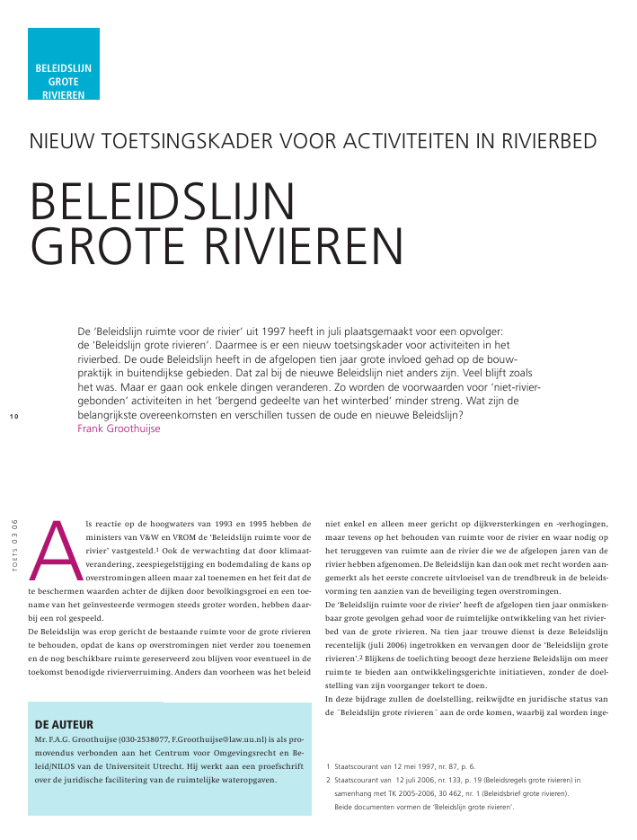 TOETS030610Als reactie op de hoogwaters van 1993 en 1995 hebben deministers van V&W en VROM de `Beleidslijn ruimte voor derivier' vastgesteld.1 Ook de verwachting dat door klimaat-verandering, zeespiegelstijging en bodemdaling de kans opoverstromingen alleen maar zal toenemen en het feit dat dete beschermen waarden achter de dijken door bevolkingsgroei en een toe-name van het ge?nvesteerde vermogen steeds groter worden, hebben daar-bij een rol gespeeld.De Beleidslijn was erop gericht de bestaande ruimte voor de grote rivierente behouden, opdat de kans op overstromingen niet verder zou toenemenen de nog beschikbare ruimte gereserveerd zou blijven voor eventueel in detoekomst benodigde rivierverruiming. Anders dan voorheen was het beleidniet enkel en alleen meer gericht op dijkversterkingen en -verhogingen,maar tevens op het behouden van ruimte voor de rivier en waar nodig ophet teruggeven van ruimte aan de rivier die we de afgelopen jaren van derivier hebben afgenomen. De Beleidslijn kan dan ook met recht worden aan-gemerkt als het eerste concrete uitvloeisel van de trendbreuk in de beleids-vorming ten aanzien van de beveiliging tegen overstromingen.De `Beleidslijn ruimte voor de rivier' heeft de afgelopen tien jaar onmisken-baar grote gevolgen gehad voor de ruimtelijke ontwikkeling van het rivier-bed van de grote rivieren. Na tien jaar trouwe dienst is deze Beleidslijnrecentelijk (juli 2006) ingetrokken en vervangen door de `Beleidslijn groterivieren'.2 Blijkens de toelichting beoogt deze herziene Beleidslijn om meerruimte te bieden aan ontwikkelingsgerichte initiatieven, zonder de doel-stelling van zijn voorganger tekort te doen.In deze bijdrage zullen de doelstelling, reikwijdte en juridische status vande ?Beleidslijn grote rivieren? aan de orde komen, waarbij zal worden inge-NiEuwTOETSiNgSkAdErvOOrAcTiviTEiTENiNriviErbEdbElEidSlijNgrOTEriviErENde`beleidslijnruimtevoorderivier'uit1997heeftinjuliplaatsgemaaktvooreenopvolger:de`beleidslijngroterivieren'.daarmeeisereennieuwtoetsingskadervooractiviteiteninhetrivierbed.deoudebeleidslijnheeftindeafgelopentienjaargroteinvloedgehadopdebouw-praktijkinbuitendijksegebieden.datzalbijdenieuwebeleidslijnnietanderszijn.veelblijftzoalshetwas.Maarergaanookenkeledingenveranderen.Zowordendevoorwaardenvoor`niet-rivier-gebonden'activiteiteninhet`bergendgedeeltevanhetwinterbed'minderstreng.watzijndebelangrijksteovereenkomstenenverschillentussendeoudeennieuwebeleidslijn?FrankgroothuijsebeleidslijngroterivierenDE AUTEURMr. F.A.G. Groothuijse (030-2538077, F.Groothuijse@law.uu.nl) is als pro-movendus verbonden aan het Centrum voor Omgevingsrecht en Be-leid/NILOS van de Universiteit Utrecht. Hij werkt aan een proefschriftover de juridische facilitering van de ruimtelijke wateropgaven.1Staatscourantvan12mei1997,nr.87,p.6.2Staatscourantvan12juli2006,nr.133,p.19(beleidsregelsgroterivieren)insamenhangmetTk2005-2006,30462,nr.1(beleidsbriefgroterivieren).beidedocumentenvormende`beleidslijngroterivieren'.TOETS030611gaan op de belangrijkste verschillen met de oude Beleidslijn. Daarnaastwordt bezien in hoeverre de herziening van de Beleidslijn daadwerkelijkmeer ruimte voor nieuwe ontwikkelingen zal bieden zonder aantasting vande oorspronkelijke doelstelling.DoelstellingMet de herziening van de Beleidslijn is de doelstelling vrijwel ongewijzigdgebleven. Wel is deze wat geconcretiseerd. De oude Beleidslijn had tot doelmeer ruimte voor de rivier te scheppen, mens en dier duurzaam te bescher-men tegen overstroming en materi?le schade door overstromingen te beper-ken; de herziene Beleidslijn heeft als meer concrete doelstelling de beschik-bare afvoer- en bergingscapaciteit van het rivierbed te behouden en ontwik-kelingen te weren die de mogelijkheid tot rivierverruiming nu en in detoekomst feitelijk onmogelijk maken.Terecht is het scheppen van ruimte voor de rivier als doelstelling geschrapt,aangezien de oude Beleidslijn er niet op gericht was en ook de herzieneBeleidslijn er niet op gericht is om extra ruimte aan het rivierbed toete voegen. De Beleidslijn heeft (en had) met andere woorden slechts eenwerende functie.Voor de ruimtescheppende doelstelling wordt een afzonderlijke planologi-sche kernbeslissing vastgesteld: de PKB Ruimte voor de Rivier.3 In deze PKBis een mix van technische en ruimtelijke maatregelen opgenomen. Dezebeogen het rivierengebied in 2015 op het door de Wet op de Waterkeringvereiste veiligheidsniveau te brengen alsmede een bijdrage te leveren aan deverbetering van de ruimtelijke kwaliteit van het rivierengebied. Voor de daad-werkelijke uitvoering van de maatregelen uit de PKB dienen, evenals bij ie-der ander project, de benodigde gronden, vergunningen en toestemmingente worden verkregen. Voor de dijkverleggingen die in de PKB zijn voorzienkan nog wel worden opgemerkt dat op de gronden die door deze maatregelbuitendijks komen te liggen de Beleidslijn van toepassing wordt.De PKBRuimte voor de Rivier dient vanwege zijn ruimtescheppende doelstellinguitdrukkelijk te worden onderscheiden van de (herziene) Beleidslijn, dieeen ruimteconsoliderende doelstelling heeft. Dit hebben de opstellers vande herziene Beleidslijn ook expliciet onderkend. Om verwarring met de PKBte voorkomen hebben zij de `Beleidslijn ruimte voor de rivier' bewust omge-doopt tot de `Beleidslijn grote rivieren'.ReikwijdteDe oude Beleidslijn was uitsluitend van toepassing op nieuwe activiteiten inhet winterbed, voor zover deze zouden kunnen leiden tot waterstandverho-ging, een feitelijke belemmering voor toekomstige vergroting van de afvoer-capaciteit en/of potenti?le schade bij hoogwater. Op activiteiten die daartoeniet zouden kunnen leiden, was het afwegingskader dus niet van toepas-sing. Onder de oude Beleidslijn was het afhankelijk van de al dan niet rivier-gebondenheid van de activiteit onder welke voorwaarden deze was toege-staan. De in een limitatieve lijst opgenomen riviergebonden activiteiten (ja,mits) werden daarbij onder minder strenge voorwaarden toegestaan dan deniet-riviergebond