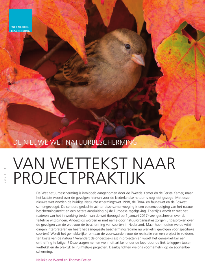De Wet natuurbescherming is inmiddels aangenomen door de Tweede Kamer én de Eerste Kamer, maar het laatste woord over de gevolgen hiervan voor de Nederlandse natuur is nog niet gezegd. Met deze nieuwe wet worden de huidige Natuurbeschermingswet 1998, de Flora- en faunawet en de Boswet samengevoegd. De centrale gedachte achter deze samenvoeging is een vereenvoudiging van het natuurbeschermingsrecht en een betere aansluiting bij de Europese regelgeving. Enerzijds wordt er met het naderen van het in werking treden van de wet (beoogd op 1 januari 2017) veel geschreven over de feitelijke wijzigingen. Anderzijds worden er met name door natuurorganisaties zorgen uitgesproken over de gevolgen van de wet voor de bescherming van soorten in Nederland. Maar hoe moeten we de wijzigingen interpreteren en heeft het aangepaste beschermingsregime nu werkelijk gevolgen voor specifieke soorten? Wordt het gemakkelijker om aan de voorwaarden voor de realisatie van een project te voldoen, ten koste van de natuur? Verandert de onderzoekslast in projecten en wordt het gemakkelijker een ontheffing te krijgen? Deze vragen nemen we in dit artikel onder de loep door de link te leggen tussen wettekst en de praktijk bij ruimtelijke projecten. Daarbij richten we ons voornamelijk op de soortenbescherming.